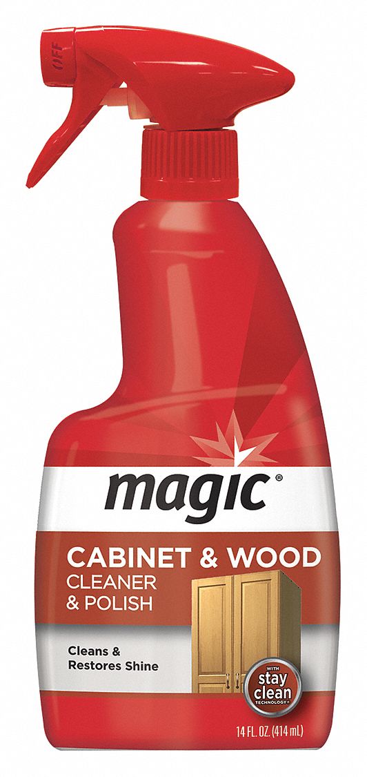 This formula guards against water marks, dirt and grime. It's available in a convenient 14 fl oz bottle. Package type aerosal, cabinet and wood cleaner, type cleaner, size 17 oz., container type can, recommended dilution ready to use, fragrance unscented, voc content 16. Magic cabinet & wood cleaner & polish aerosol restores shine and beauty to your cabinets and furniture. Together they remove dust, food stains, cooking grease and kitchen soils while also adding a protective coating that repels water marks, dirt and grime.